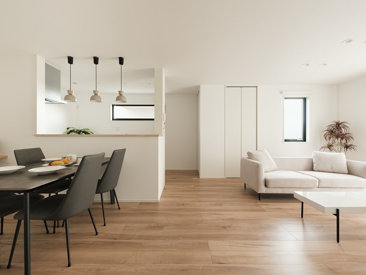 広々としたリビングでは、心地よい空気に包まれながら贅沢なひとときを。贅沢にスペースをとった家事室では、快適に家事を進められます。