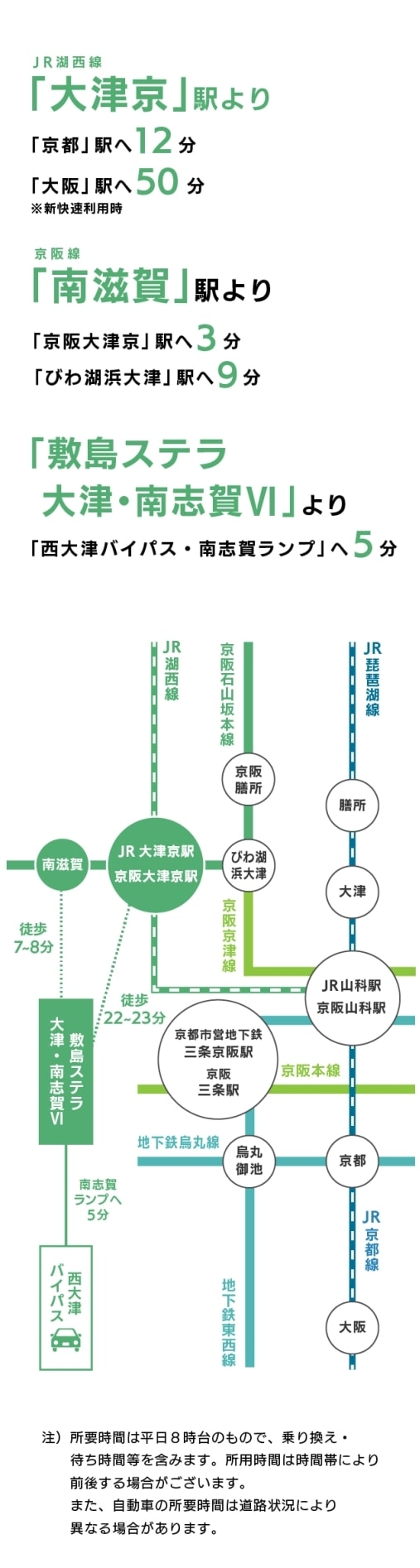 現地から京阪「南滋賀」駅までは徒歩7~8分。約9分の「びわ湖浜大津」駅から京都山科方面へのアクセスも可能です。また、JR湖西線「大津京」駅へは2駅。現地から徒歩22~23分で向かうことも可能です。