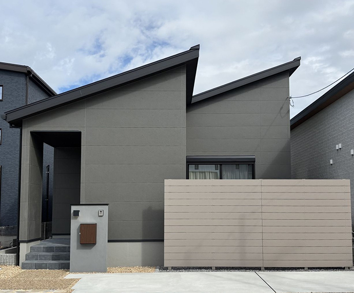 片流れ屋根とグレーの外壁がシャープな印象
