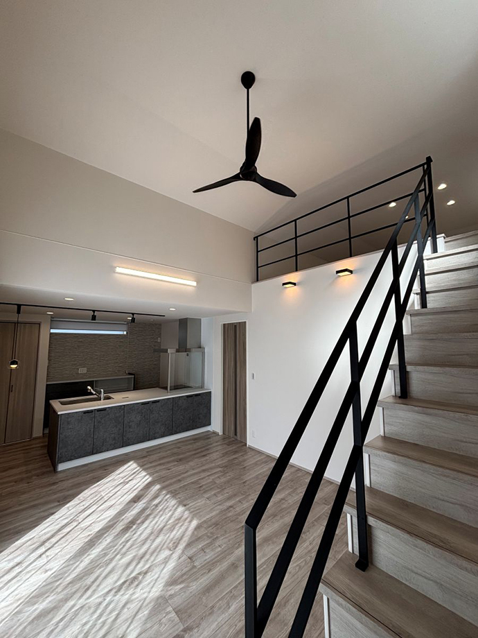 黒のアイアン手すりとシーリングファンが、スタイリッシュなアクセントになっています!