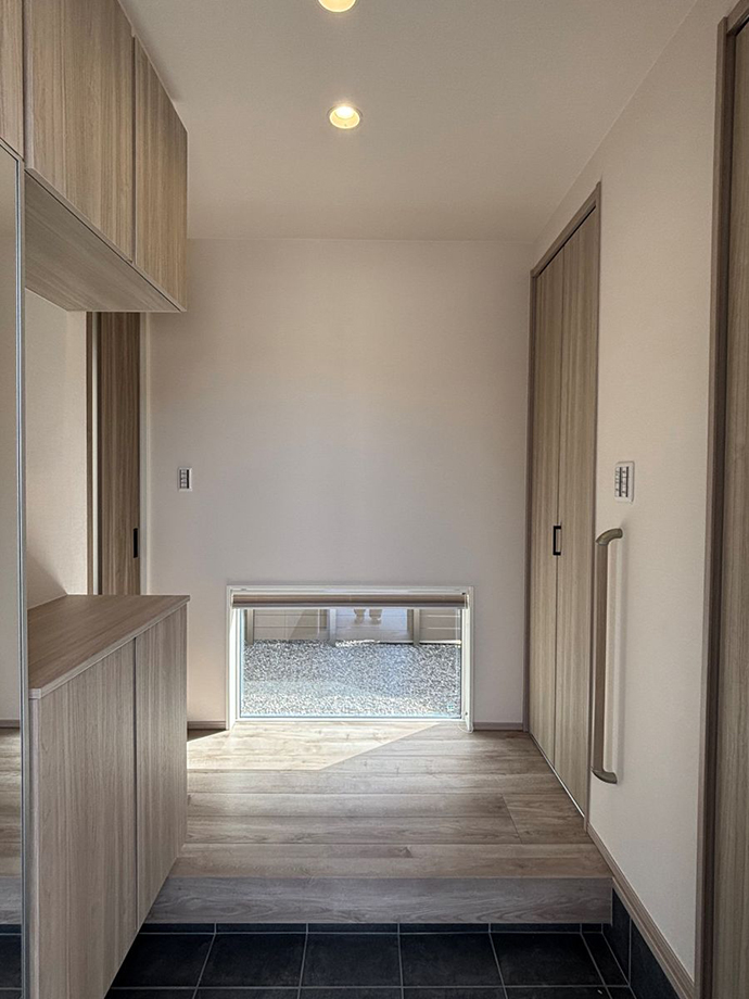 玄関を入ると、奥の庭スペースに面して設けた地窓が印象的なアクセントになっています。