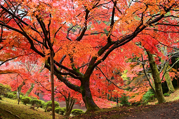 イロハモミジ、ヤマモミジなど150本のモミジが境内周辺を染め上げ、圧巻の眺めが広がります。