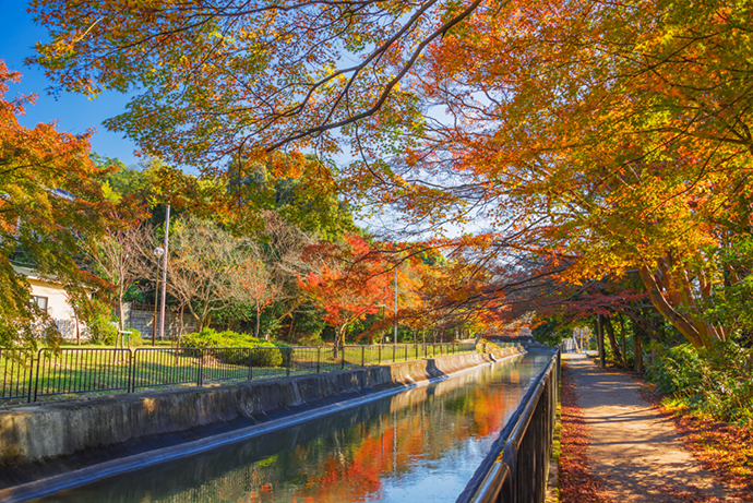 ゆったりとした疏水の流れと四季折々の木々の表情が豊かな遊歩道。