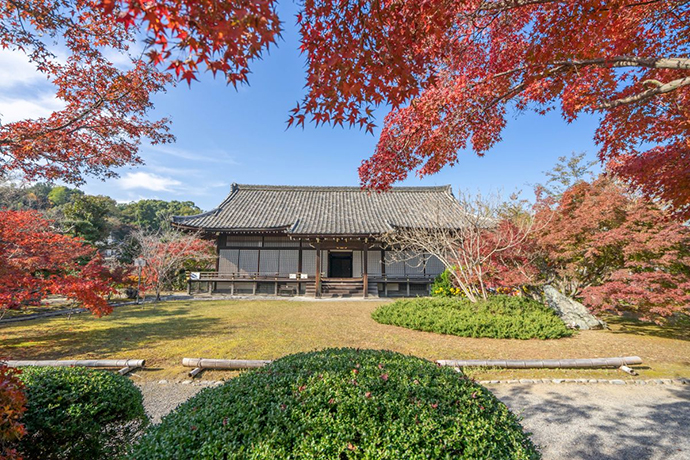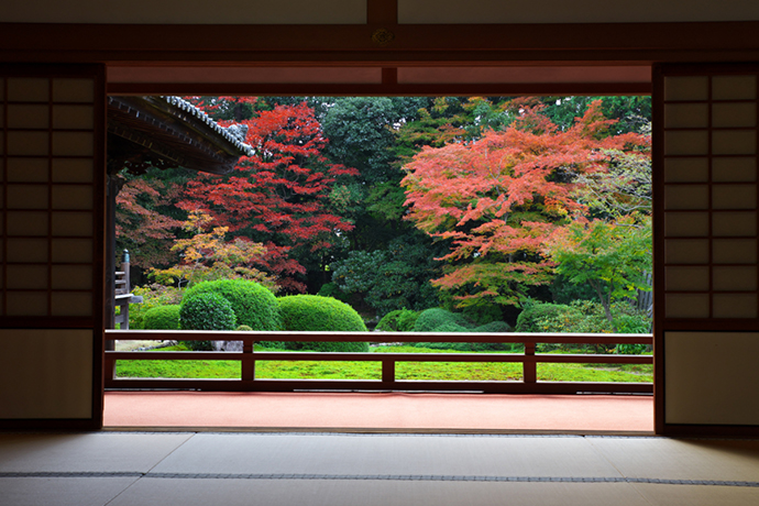紅葉の時季には、モミジの美しいグラデーションが東山連峰を借景に庭園や書院、宸殿を彩ります。