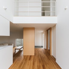 離れはロードバイク置場やDIYなど趣味のスペースに。吹き抜けと階段でリビングと繋がっています。母屋と離れの間に設けたガレージは屋根付きで雨の日も安心です。