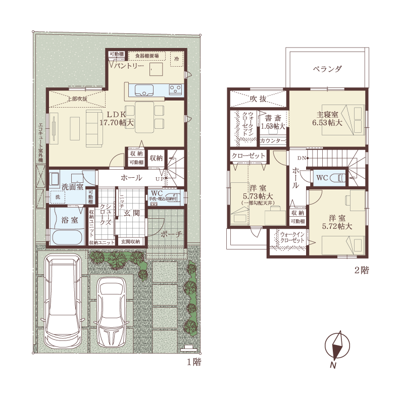 玄関は来客用と普段使いの2WAY動線でいつもスッキリ。リビングの一部に開放感をもたらす吹き抜けを採用。主寝室には書斎とWIC、奥行きのあるベランダを備えています。