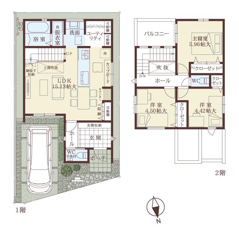 キッチンからユーティリティ、水廻りをつなぐ時短動線で家事効率がアップします。
