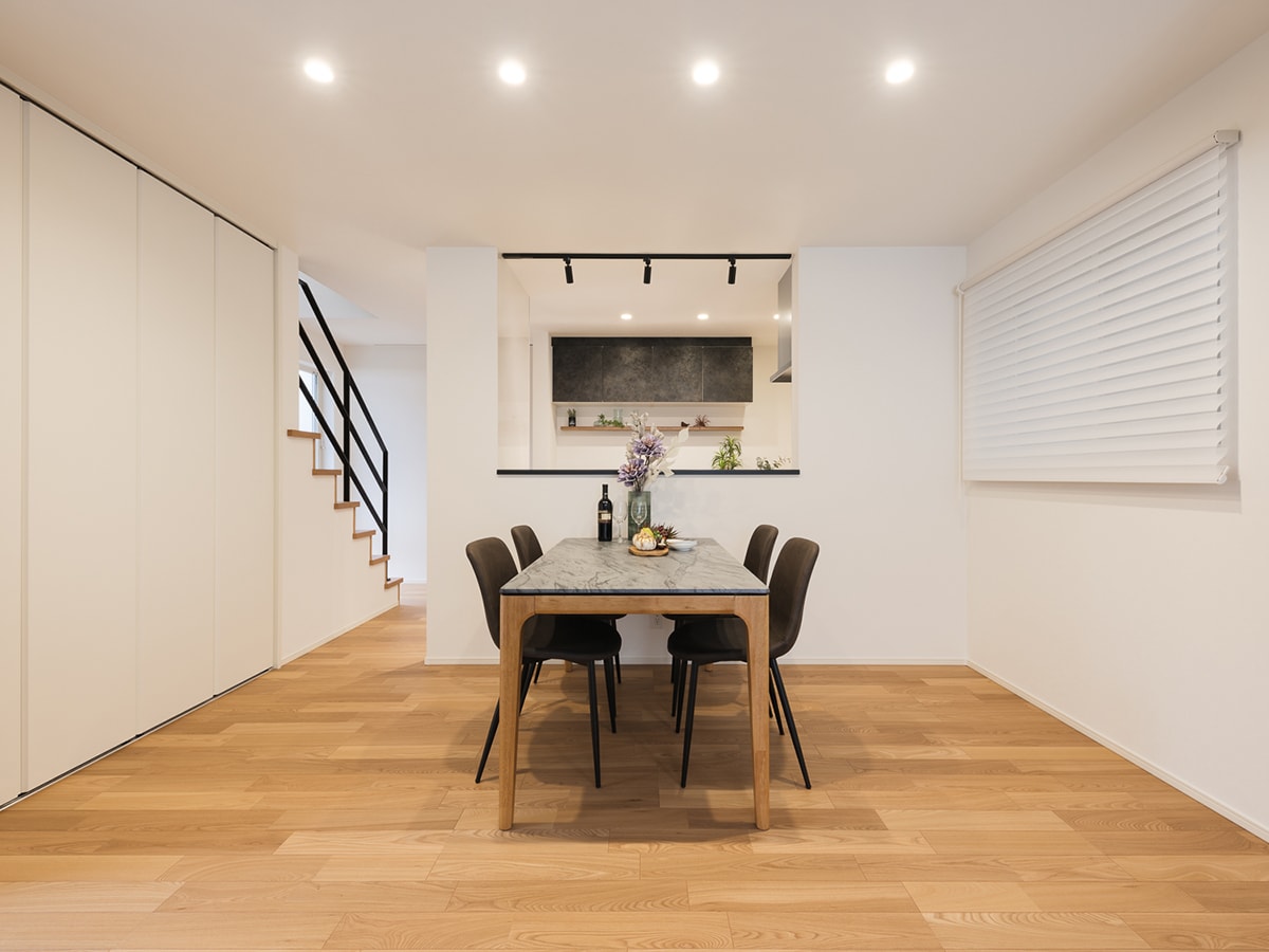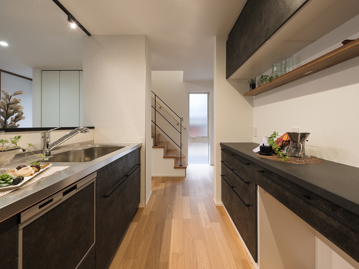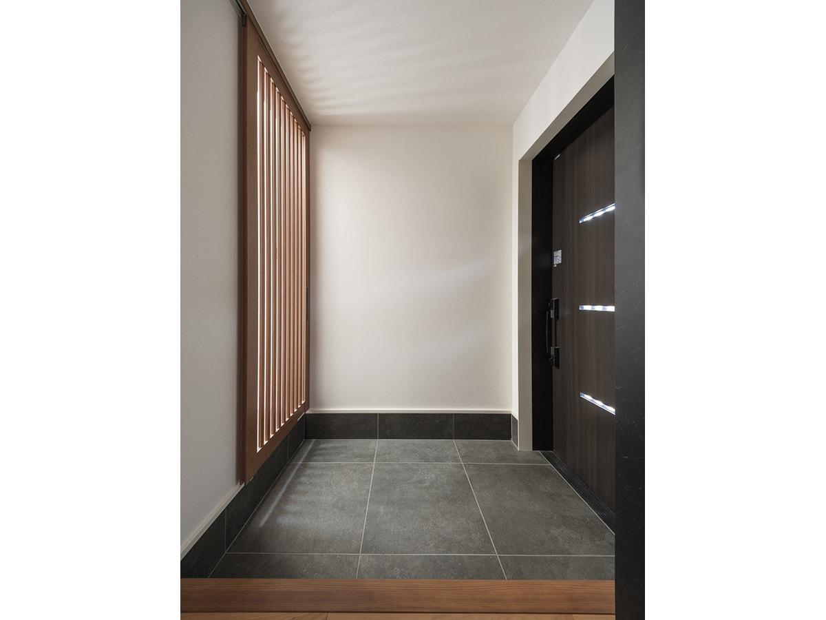 ポーチや玄関、リビング、2階ユーティリティにタイルを採用し空間の統一感とお洒落なゾーニングを実現。