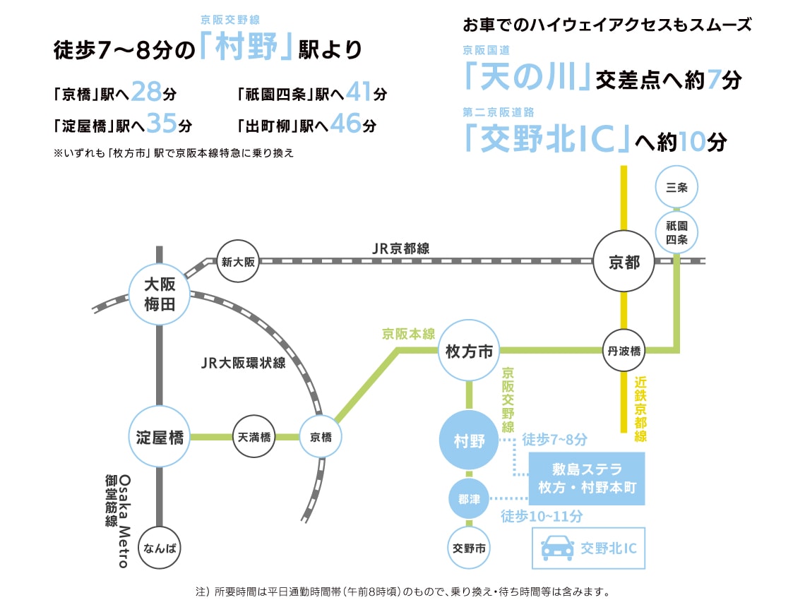 徒歩7~8分の「村野」駅から「枚方市」駅へ3駅6分の便利な立地。駅前には枚方モール、京阪百貨店、イオンなど大型ショッピング施設が揃っており、大阪・京都・京阪沿線各都市へのアクセスも便利です。