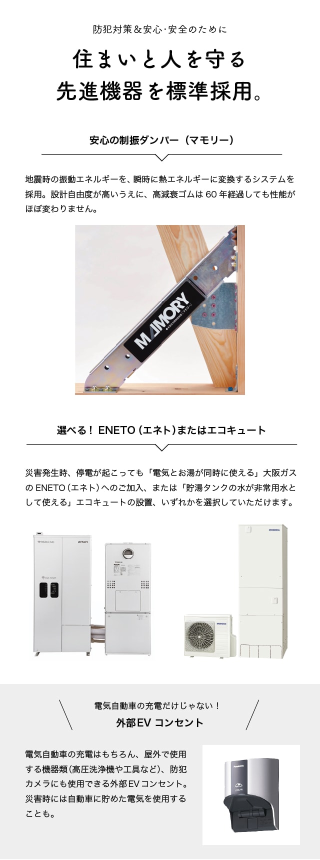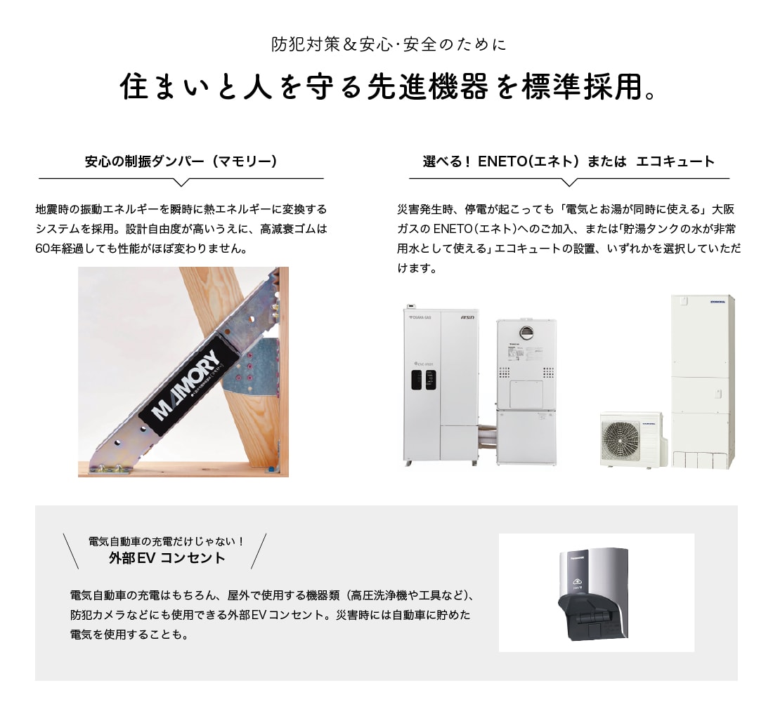 耐震等級3+断熱等級5(ZEH対応)が標準仕様。また第1種換気システムにも対応しているなど、安心・安全・快適な住まいをご提供しています。