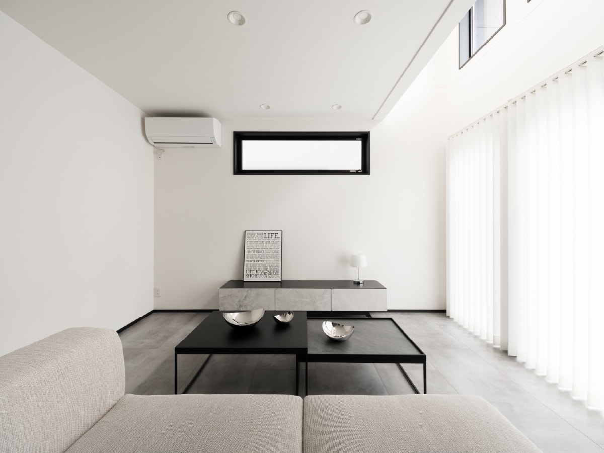 高天井のリビングは南向きの掃き出し窓や高窓から外光が注ぎ...