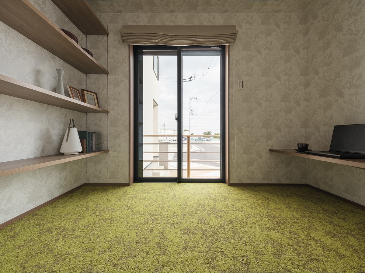 南面にワイドな掃き出しのあるリビングは高天井で伸びやかに。畳コーナーは垂れ壁で空間に奥行きと立体感を演出しました。主寝室ロフトのワークスペースとWICも注目です。