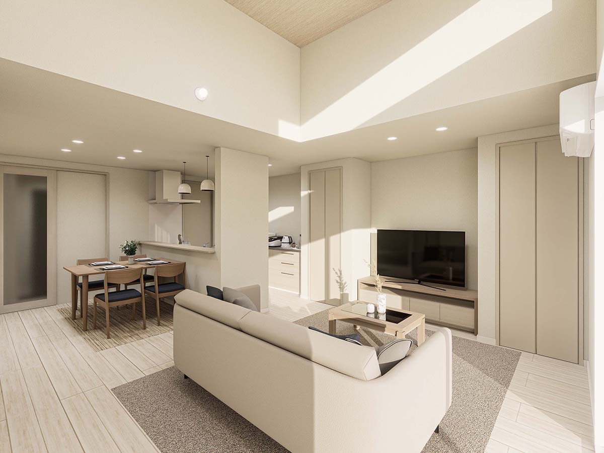 高天井のリビングは南向きの掃き出し窓や高窓から外光が注ぎ、明るく開放的な空間に。キッチンから見守れる畳コーナーは、赤ちゃんのお昼寝や幼児の遊び場に最適。