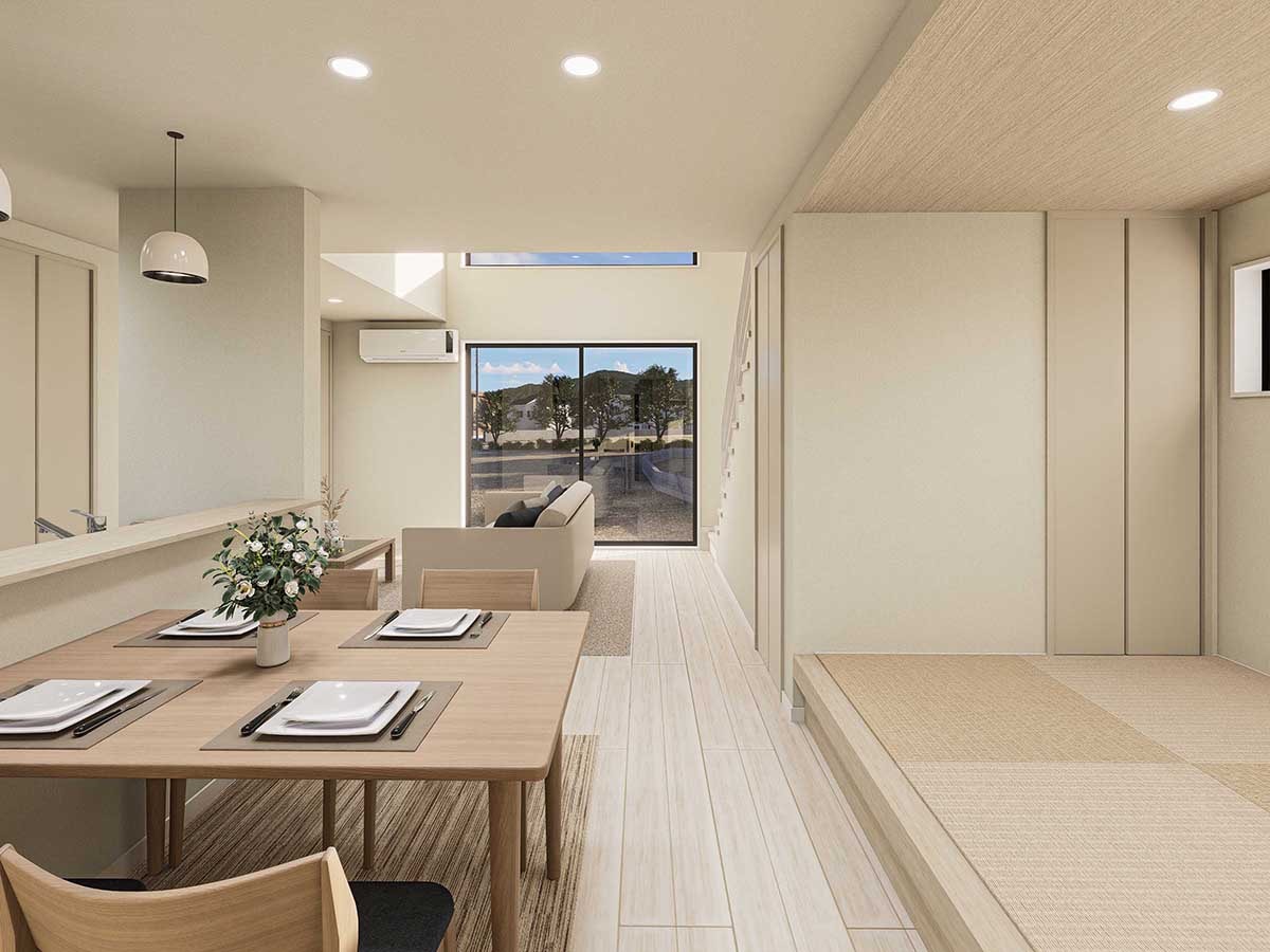 1階はワンルーム感覚の広いLDKで、畳コーナーも併設。洗面脱衣分離で家族間や来客時 のプライバシーにも配慮しています。