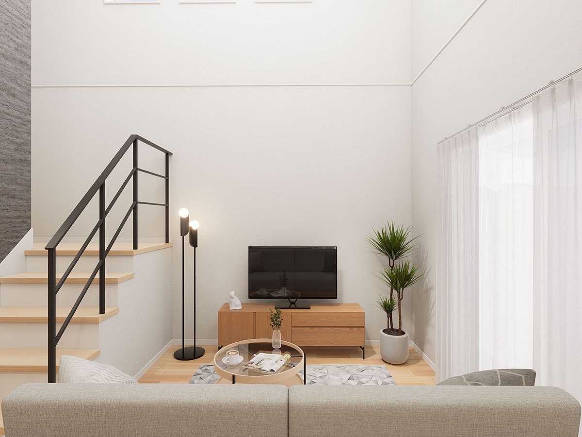 リビングは“広見え”効果のある吹き抜けとスケルトン階段の組...