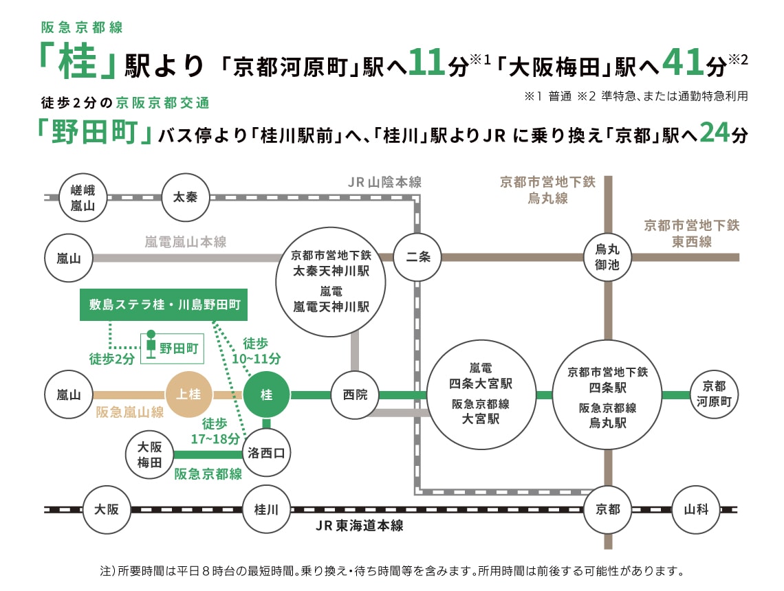| 交通 | 阪急京都線「桂」駅 徒歩10~11分 阪急京都線「洛西口」駅 徒歩17~18分 JR京都線「桂川」駅 徒歩23~24分 京都市バス「野田町」停留所 徒歩1~2分 |