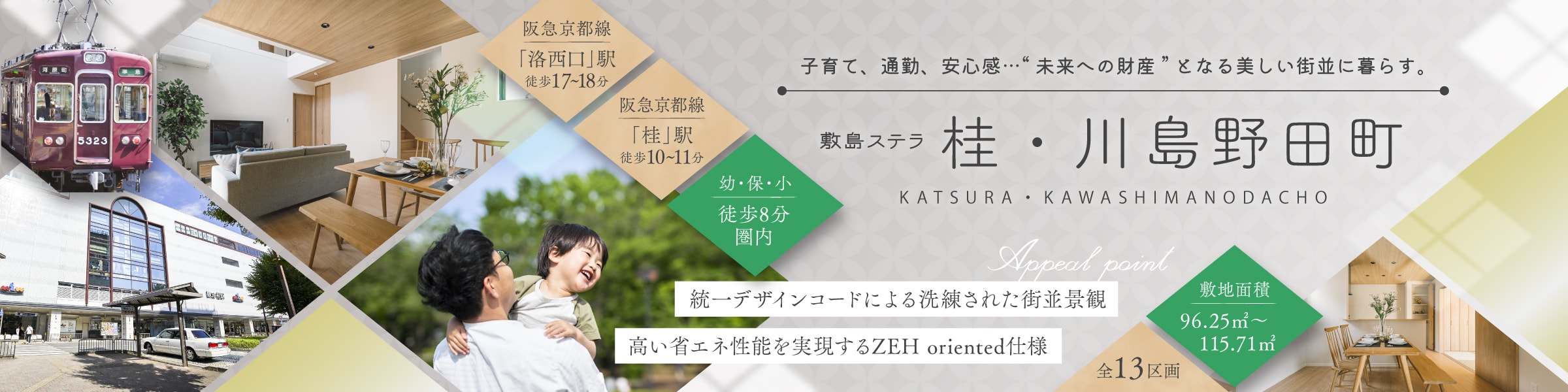 | 交通 | 阪急京都線「桂」駅 徒歩10~11分 阪急京都線「洛西口」駅 徒歩17~18分 JR京都線「桂川」駅 徒歩23~24分 京都市バス「野田町」停留所 徒歩1~2分 |