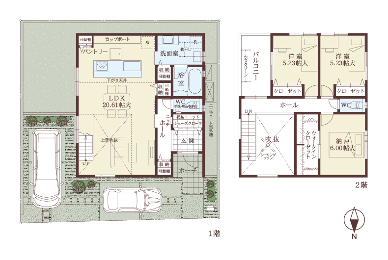 南向きのリビングは開放感たっぷりの吹き抜けを。配膳や片付けが楽なカウンター付きキッチン、プライバシー配慮の洗面脱衣分離、2階FCLやホール収納など使い勝手の良さが魅力です。