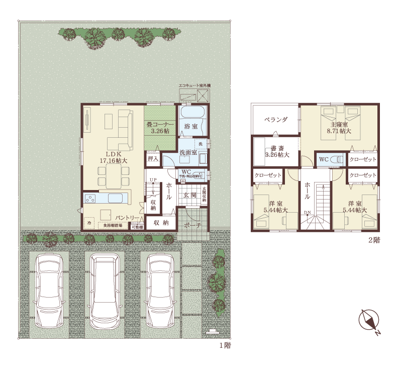 南東側にお庭、北側に3台分の駐車場を確保したゆとりのプラン。リビングには多目的に使える畳コーナーを設けました。広めの主寝室に書斎スペースも備えています。