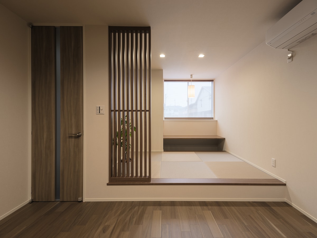1階畳コーナーはインテリア格子と掘り込みカウンターで集中できる空間に。主寝室のフリースペースはデコ窓で吹き抜けからの採光を確保しました。