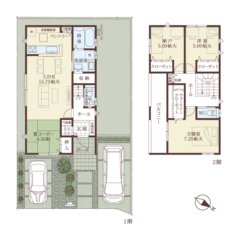 キッチンから目が届く畳コーナーはお子様のお昼寝や遊び場、また家族団らんの居間や客間としても利用可。洗面室の大きな収納や、幅6.37mのワイドな2階ベランダも見逃せません。