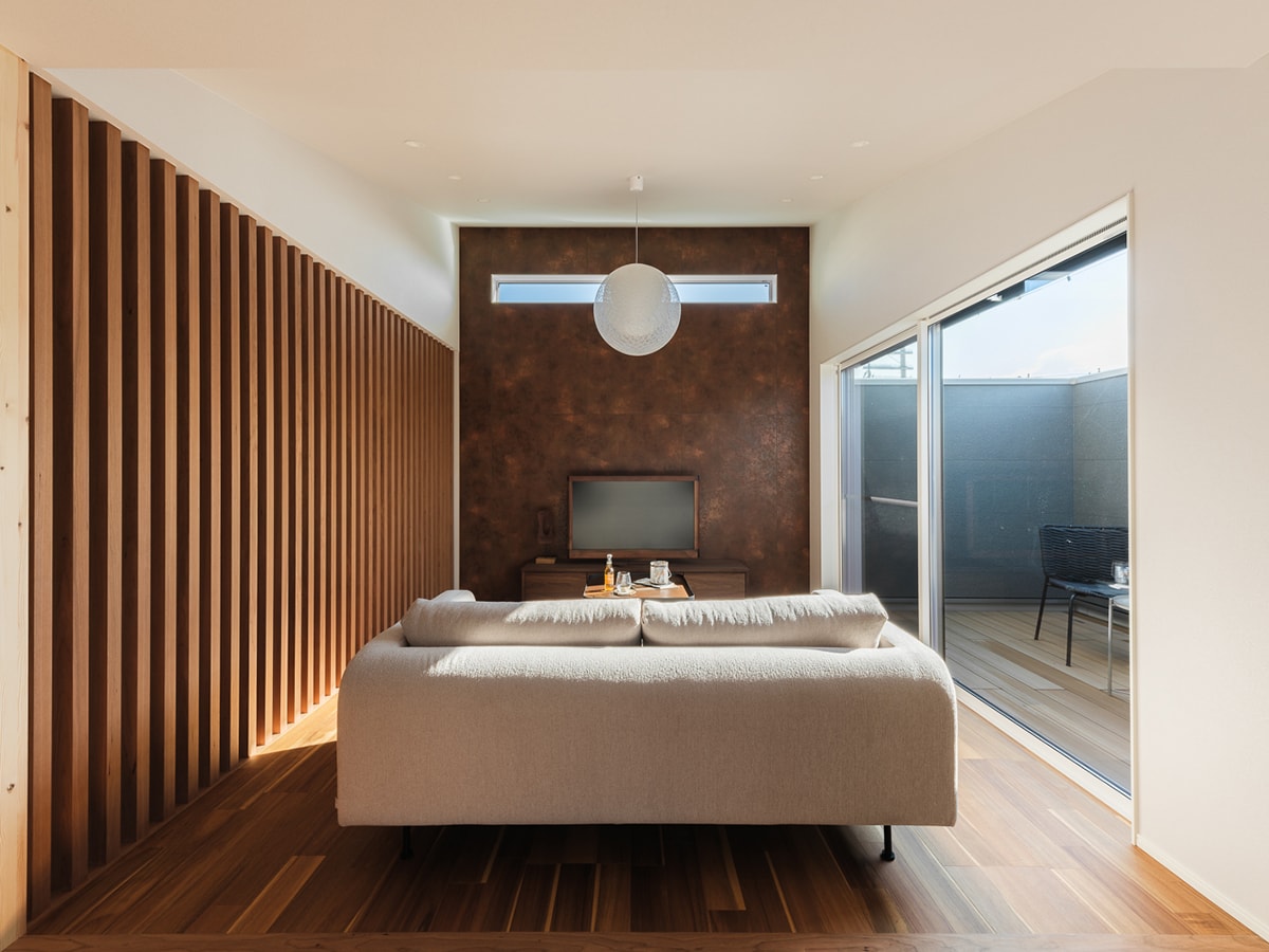 居室は出入りがしやすい1階に、LDKを通風採光の良い2階に配置しました。小上がりのリビングは広いバルコニーと最大高5mの勾配天井で開放的な空間に。