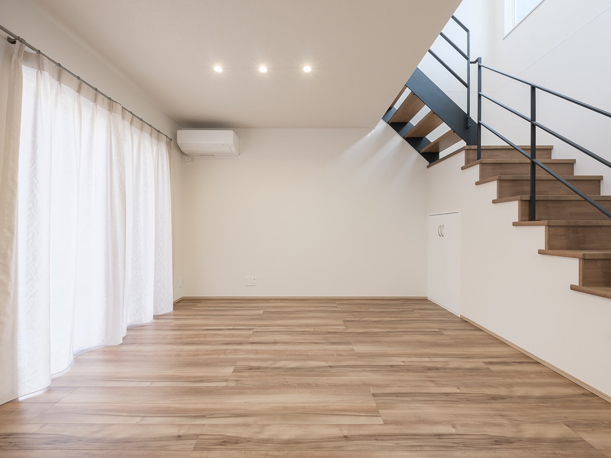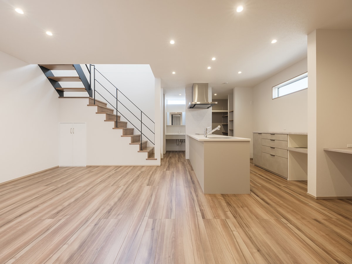 LDKは吹き抜けとスリット階段、3連高窓からの採光で面積以上の広がり感を演出。キッチンからユーティリティ、水廻りをつなぐ時短動線で家事効率がアップします。