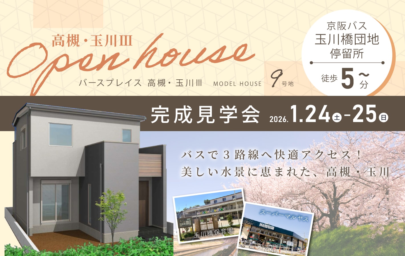 現地から徒歩5∼6分の「玉川橋団地」バス停から阪急京都線「茨木市」駅、JR 東海道本線「茨木」駅、京阪本線「枚方市」駅と3つの駅へアクセスできます。各駅にはイオンモールやビックカメラなど大型商業施設もあり、仕事帰りなどご利用駅の近くでお買い物を済ますこともできます。