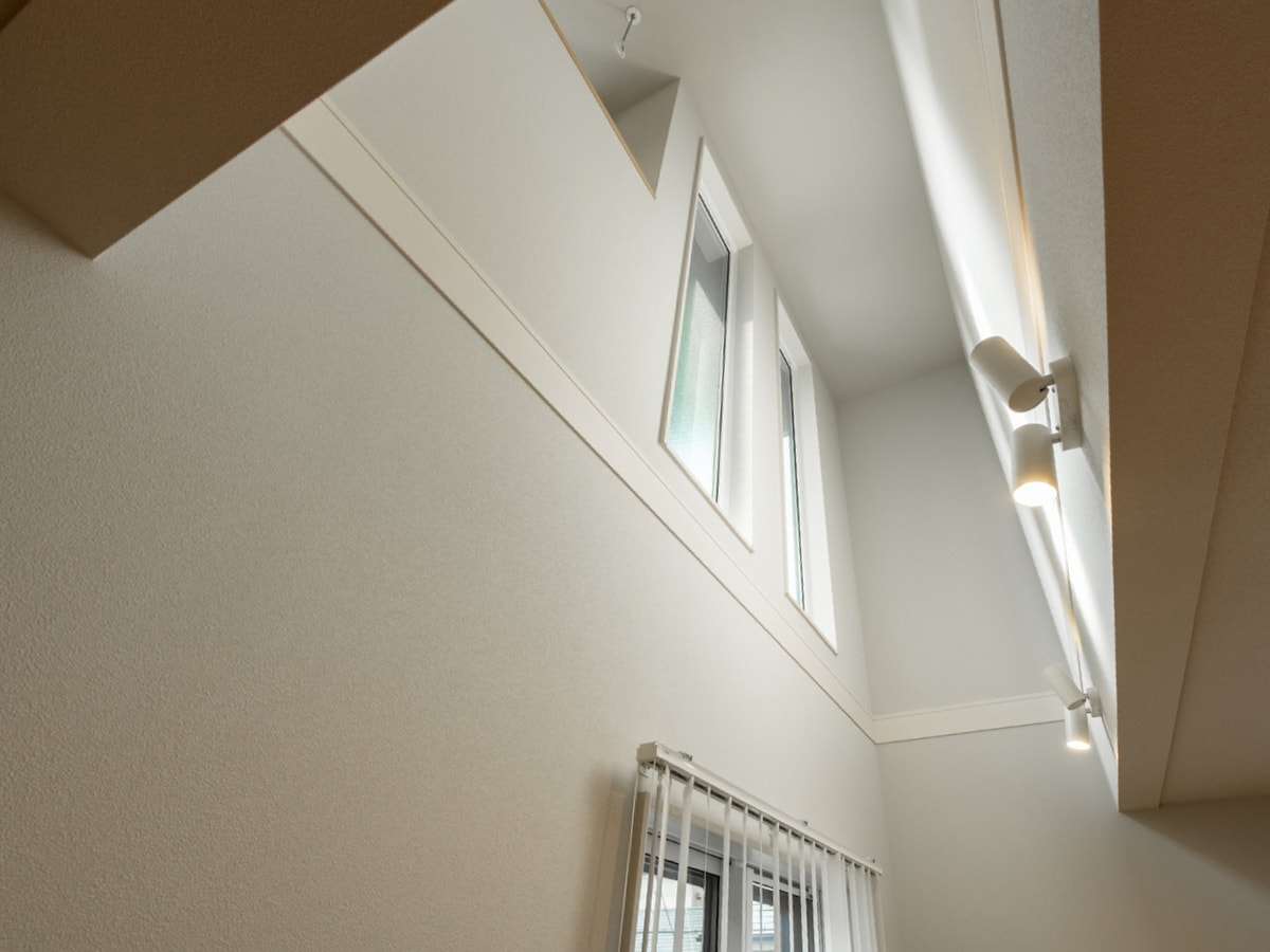 生活の中心となるLDKを2階に配置した3階建プラン。2階リビングに設けた吹き抜けは東向きの高窓からの朝の光を取り込みます。