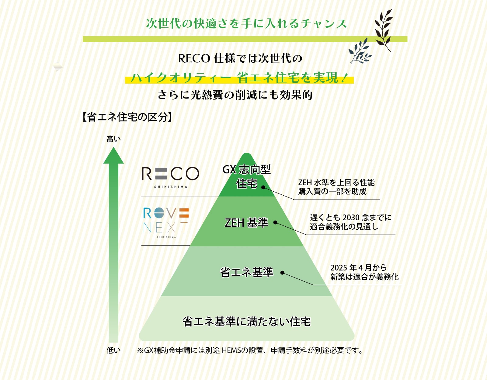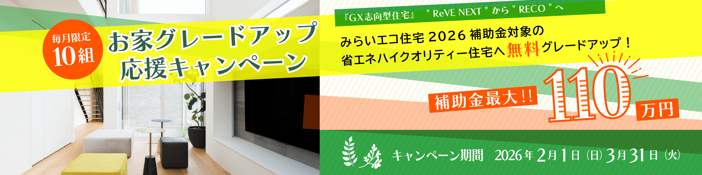 環境にも、暮らしにも、ワンランク上の選択を。キャンペーン期間中のご成約で、標準「ReVE NEXT(レーヴネクスト)」仕様から上位グレード「RECO(レコ)」仕様へ無料アップグレード!補助金(最大110万円)を活用し、性能も快適さも高めた住まいを、今だけお得にご提案します。 開催期間:2026年2月1日(月)~3月31日(火)