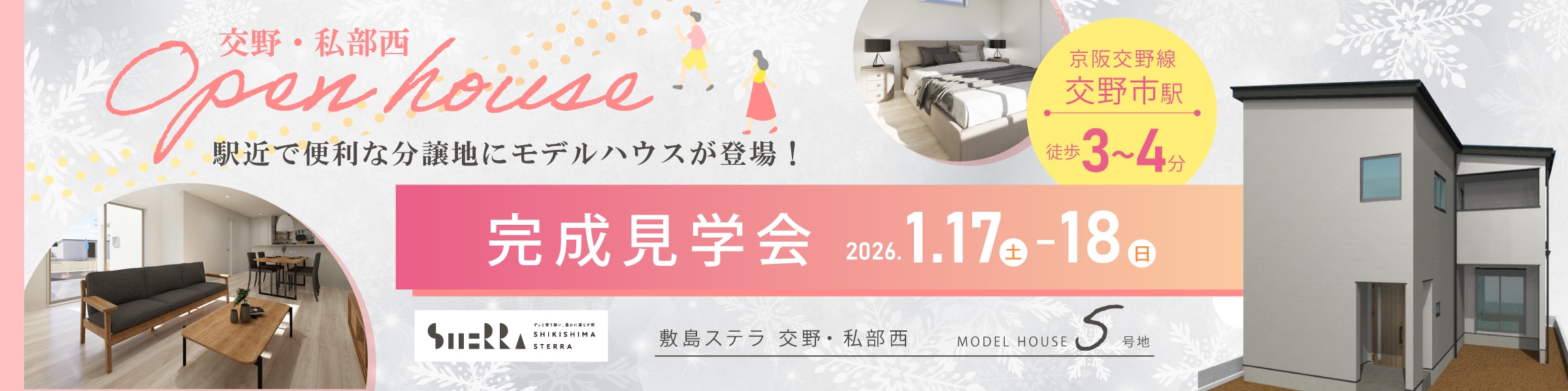 敷島ステラ 交野・私部西 5号地 モデルハウス完成見学会を開催! 開催日:2026年1月17日(土)~18日(日)