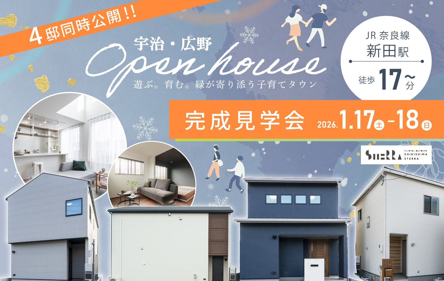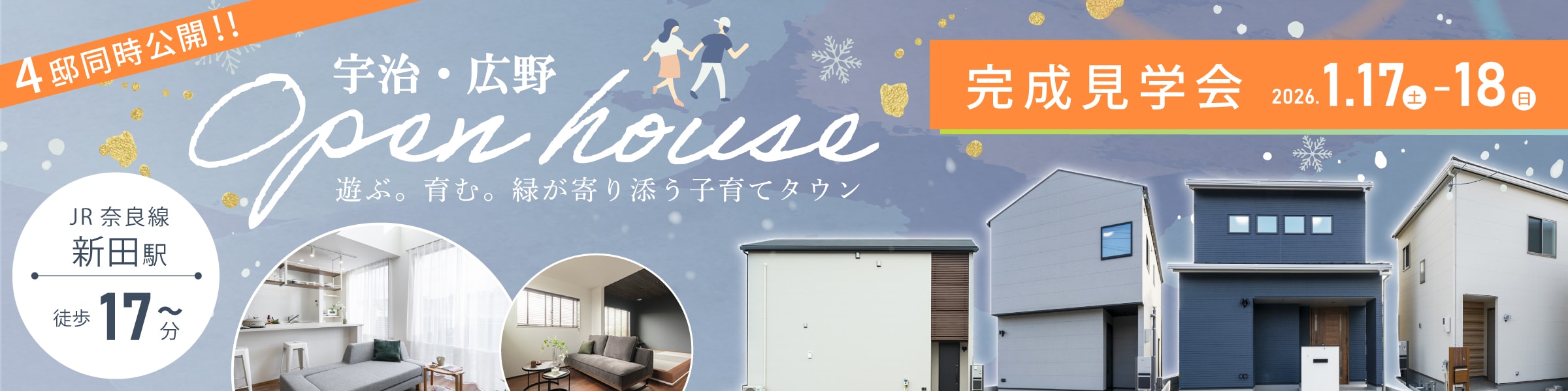 2026年1月17日~18日開催! 宇治市広野町にてモデルハウス公開中! 個性豊かな4邸が見学対象! それぞれ異なる魅力を持つ住まいを、見比べて選べるチャンスです。
