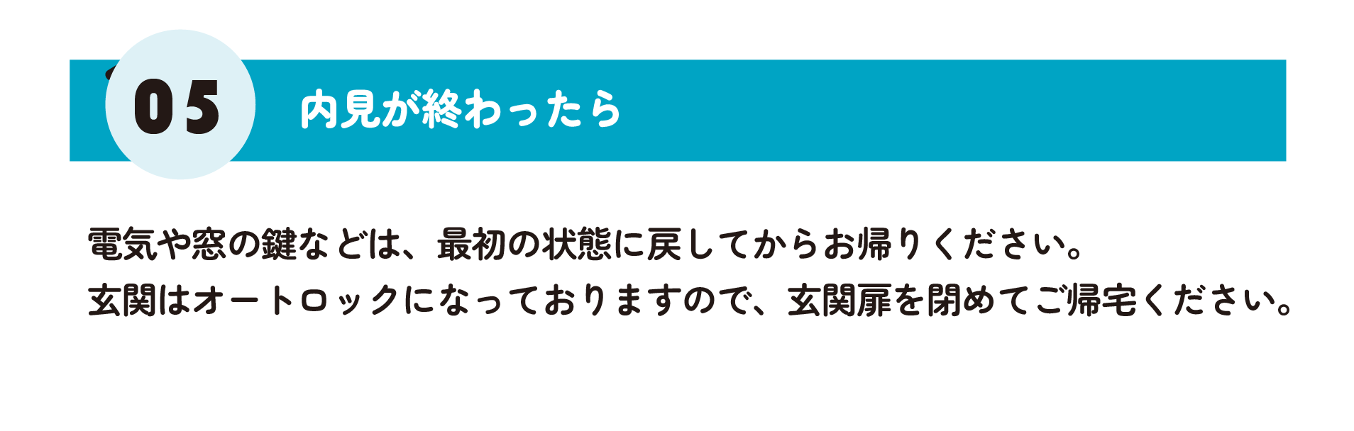 ●内見後、電気・窓の鍵・シャッター・インテリア等は元の状態にお戻しください。