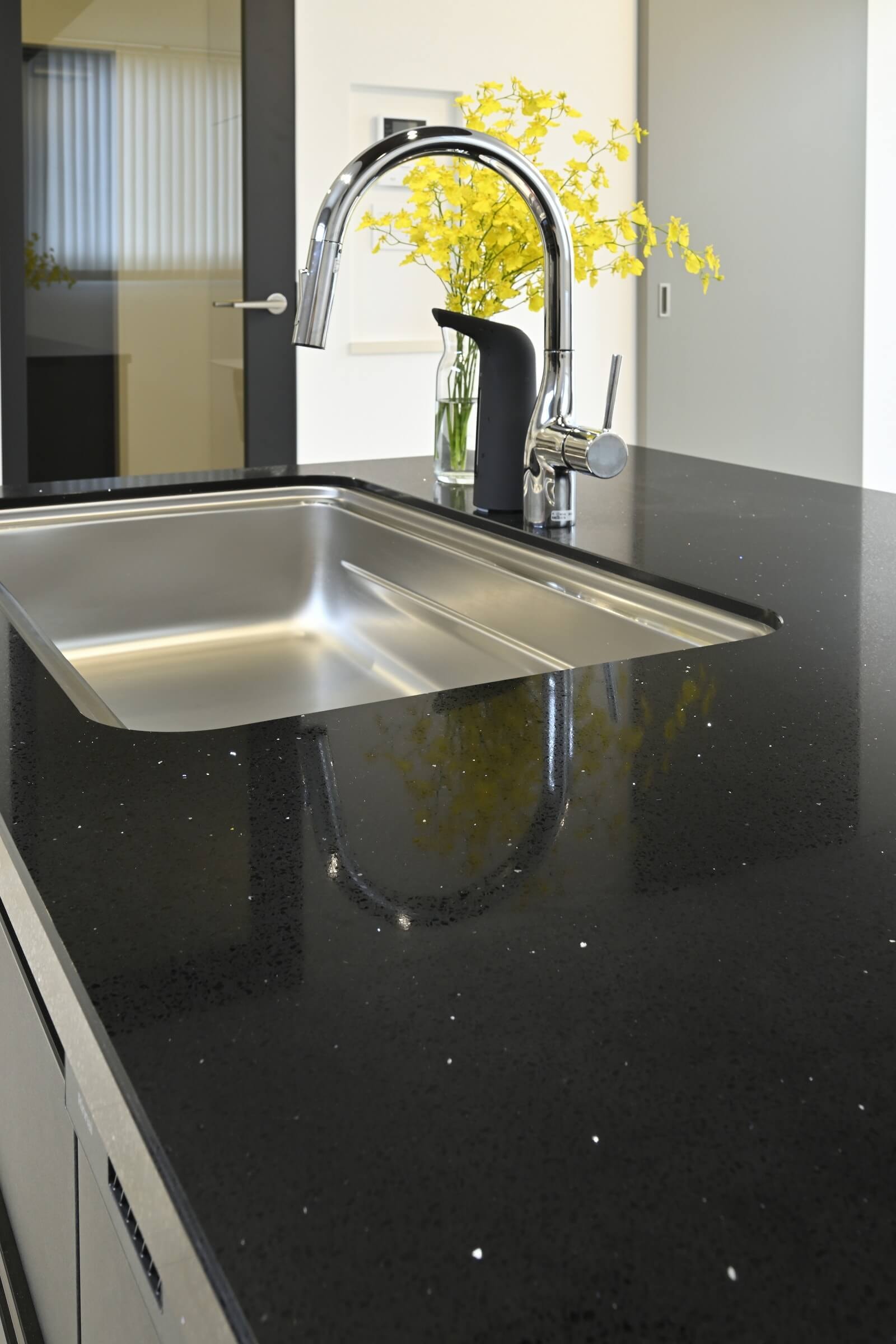「ショールームでキラキラした天板がひときわ輝いて見えました(笑)。少々高額になりましたが、普通の人造大理石よりキズが付きにくいところもお気に入りです」