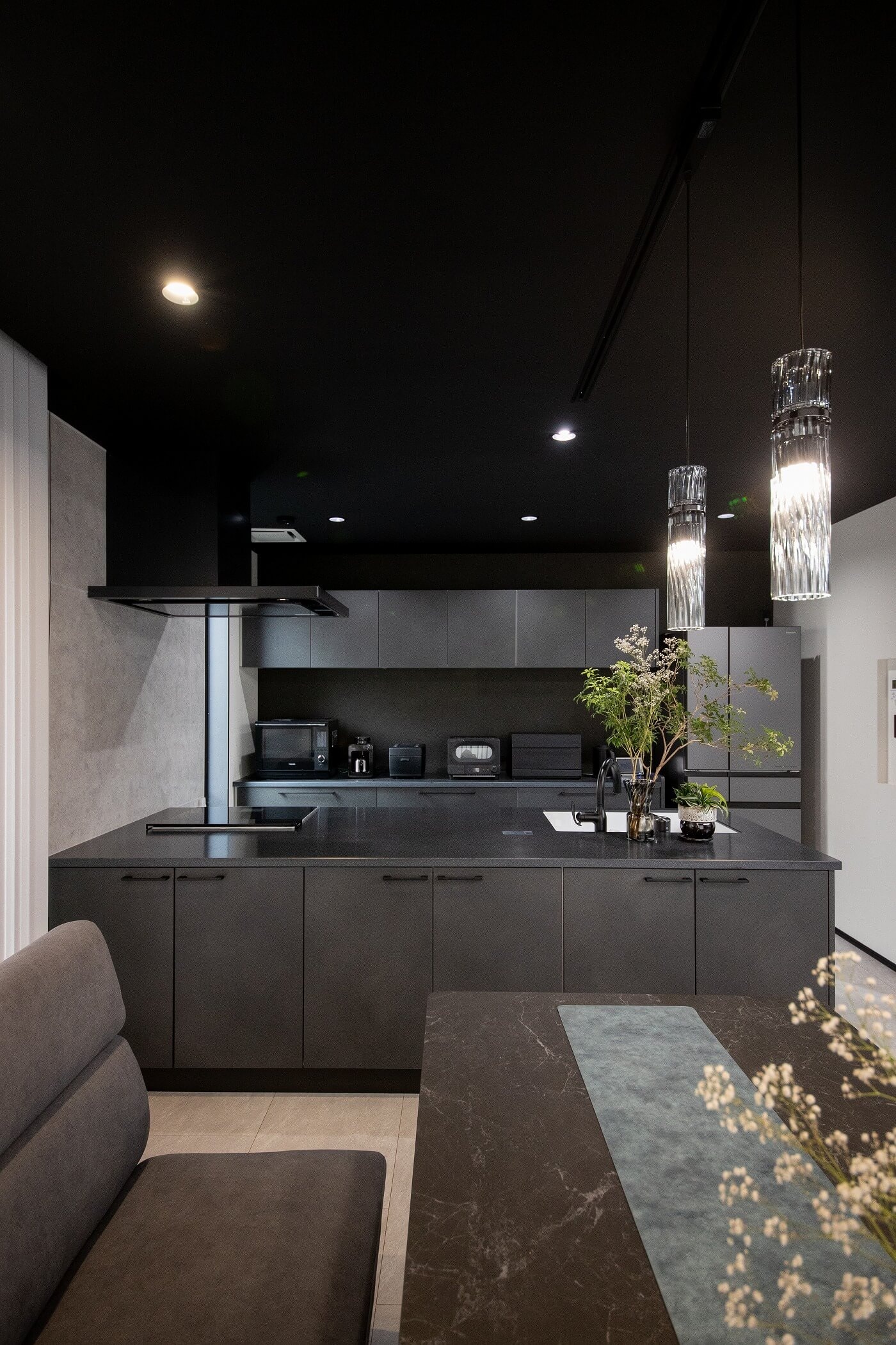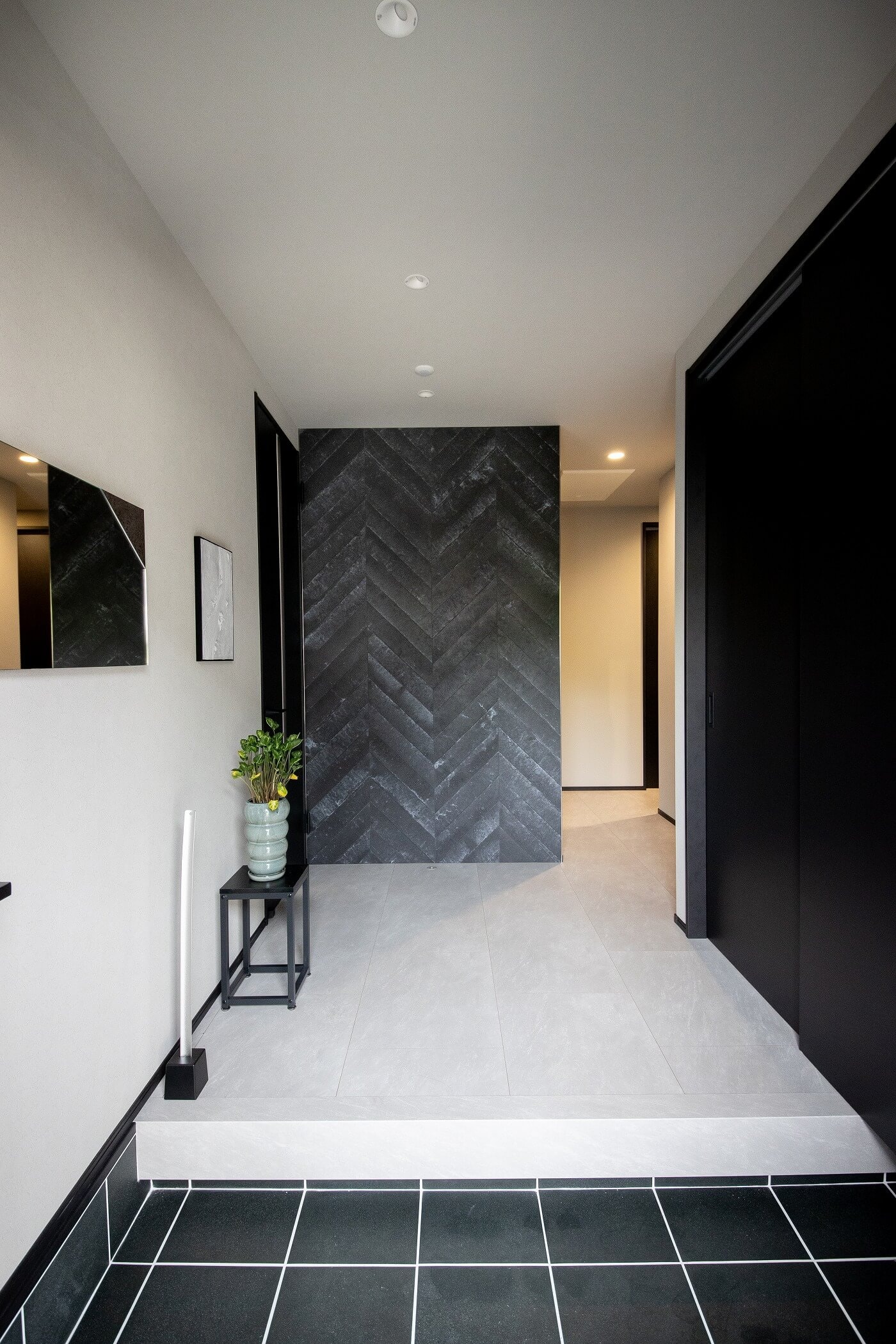 勾配天井を生かした吹抜けのLDKは約22帖の広さがあり、中でも漆黒に輝く大理石調タイルのTVボードが目を引きます。こだわりの床材とTVボード、モノトーンでありながら質感の異なる建材を組み合わせ、本物志向の高級感をさり気なく演出されています。