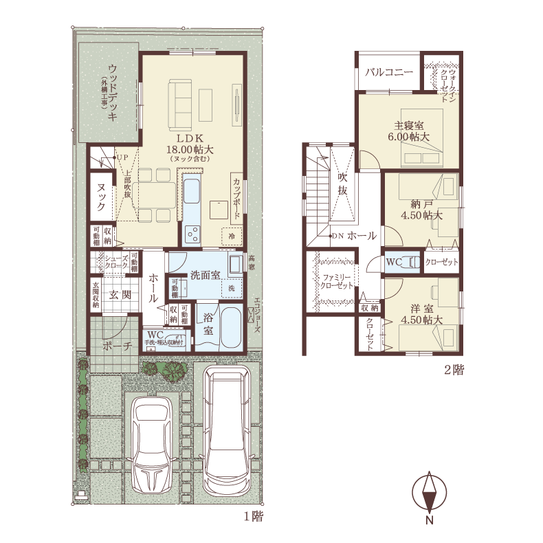 スタイリッシュなアイアン手摺のヒナ壇階段下部にヌックを設けました。キッチンを中心にLDK・洗面・ホールを回遊できる“家事楽”動線が魅力のプランです。