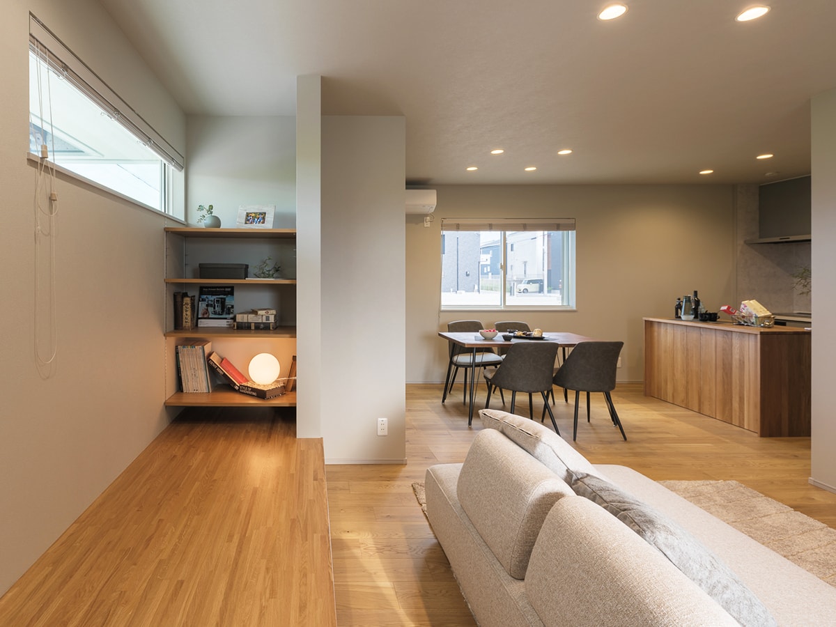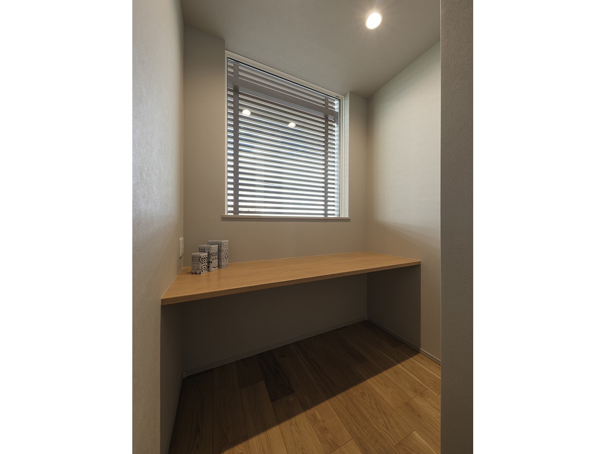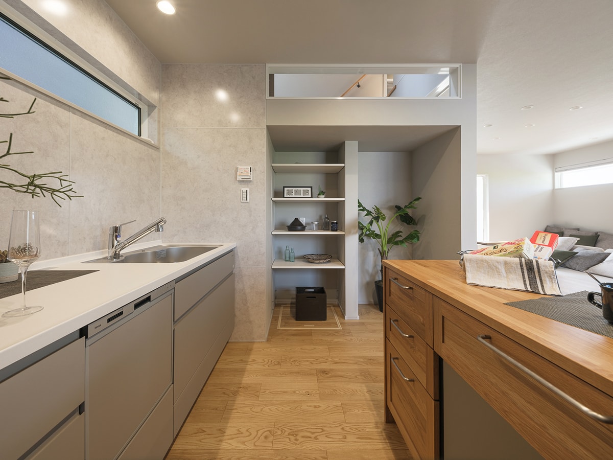 小上がりベンチやFCL、パントリーを設置。中2階のユーティリティや2階カウンターコーナーはヌック感覚の寛ぎ空間です。
