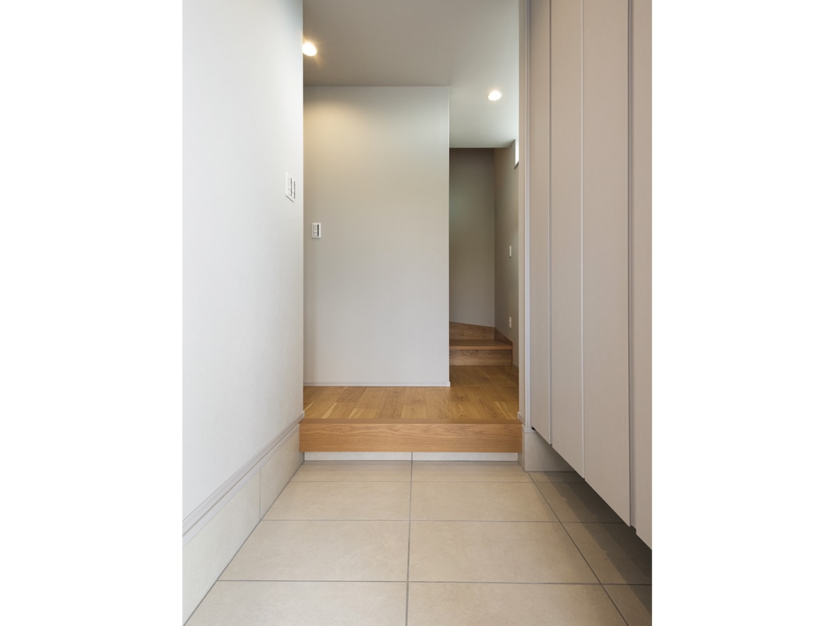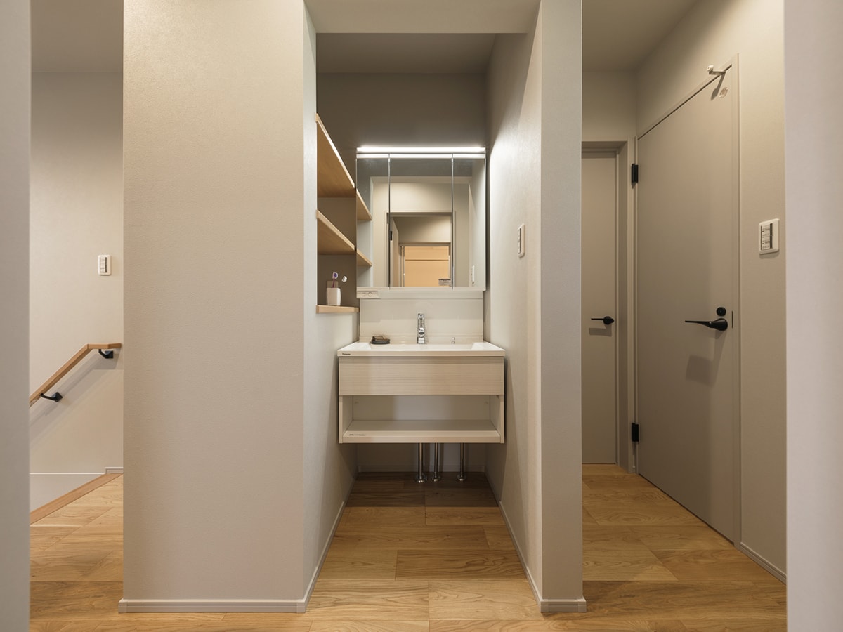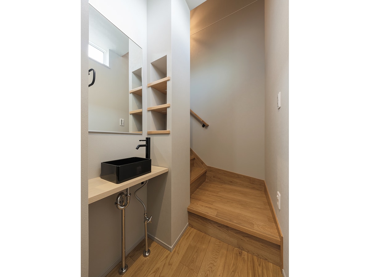 小上がりベンチやFCL、パントリーを設置。中2階のユーティリティや2階カウンターコーナーはヌック感覚の寛ぎ空間です。