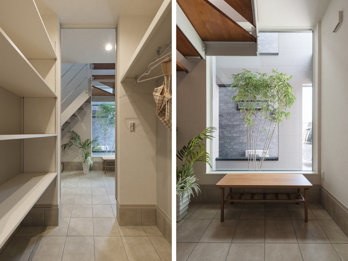 吹き抜けのスケルトン階段や坪庭を望むFIX窓がある玄関は、カフェ感覚で寛げるオシャレな空間です。