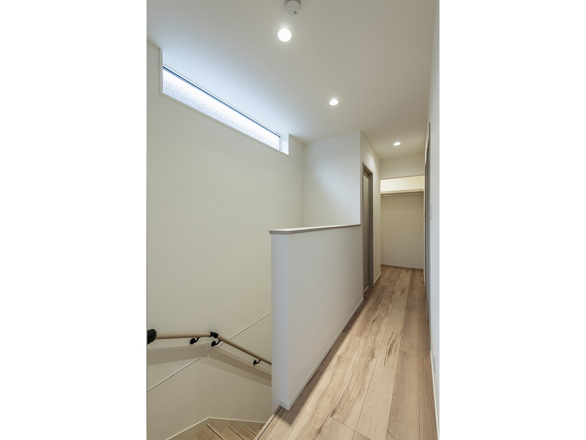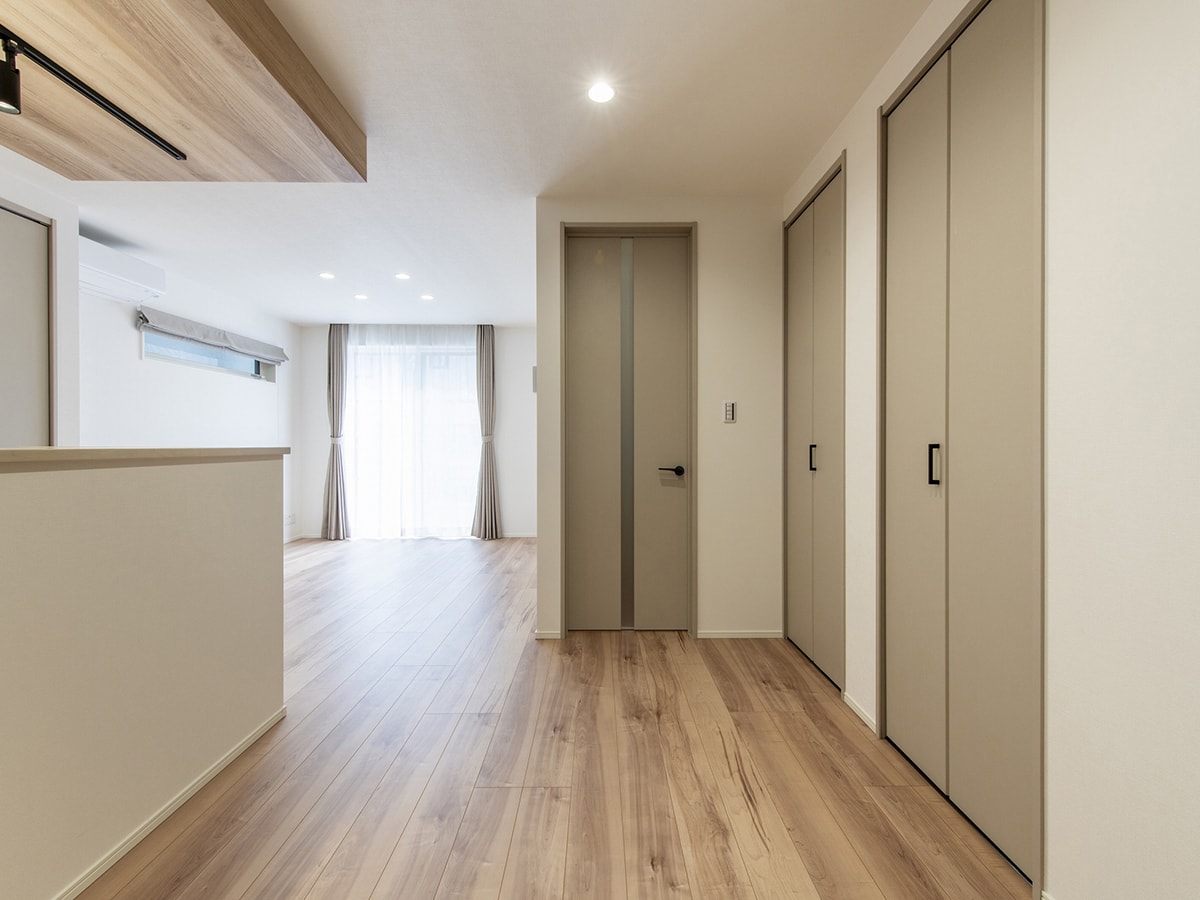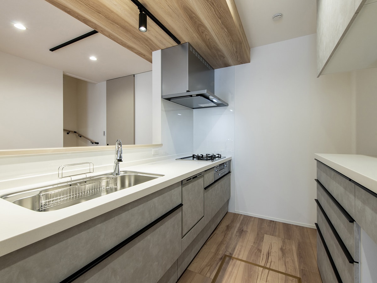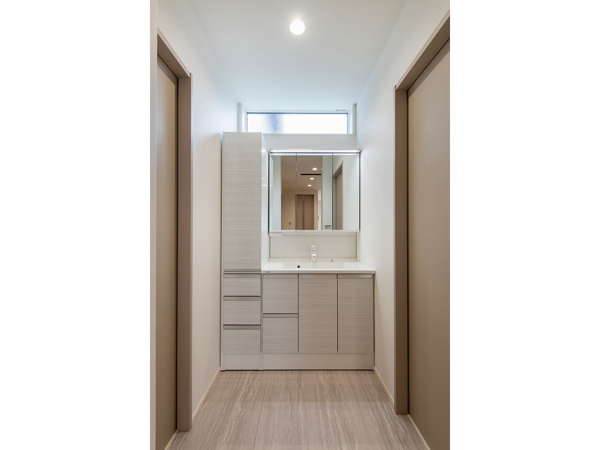 南東に開口を設けた開放的なリビングと、下がり天井のキッチンで空間にメリハリを…。洗面脱衣分離はじめ、階段下収納、パントリー、2階FCLなど機能も収納も充実。