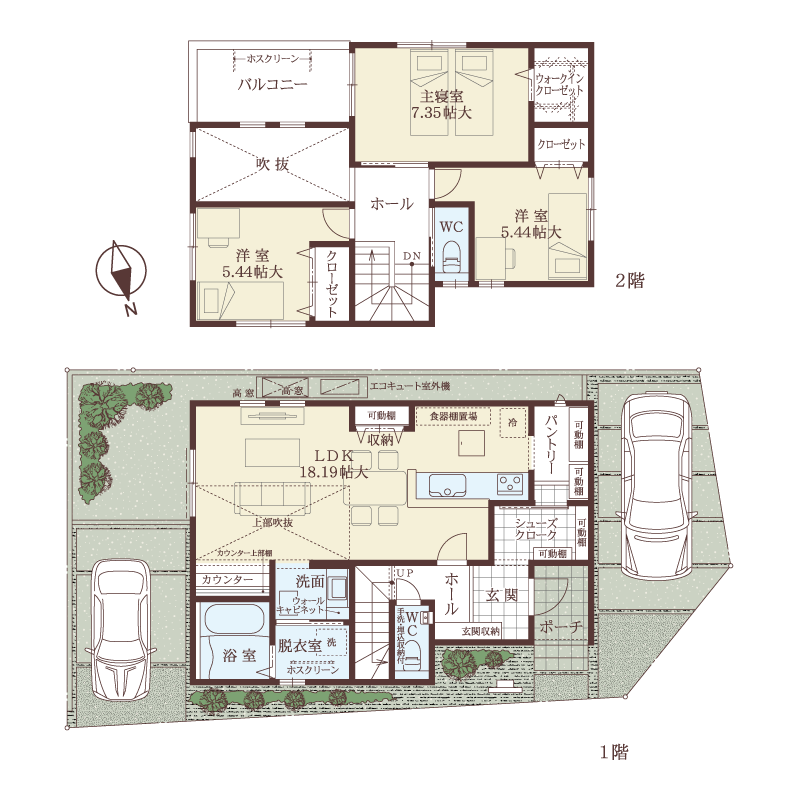 SCLからパントリーへ直行でき、買物帰りの食材収納がスムーズに。リビングは2階ホールと繋がる吹き抜けと、タレ壁で個室感のあるカウンターコーナーを設けています。
