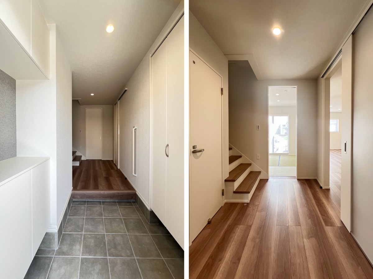 広めの玄関ホールは右手にシューズクローク、左手に玄関収納を完備。ホールから右にリビング、左に階段、正面奥に和室と動線にもゆとりと奥行きが感じられます。