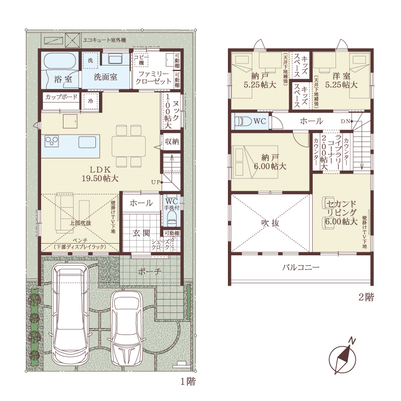 1階LDKはフルフラットキッチンに冷蔵庫が収まるパントリー、造作ベンチ、ヌック、FCLと盛り沢山のこだわり仕様。2階にライブラリーコーナーも備えています。