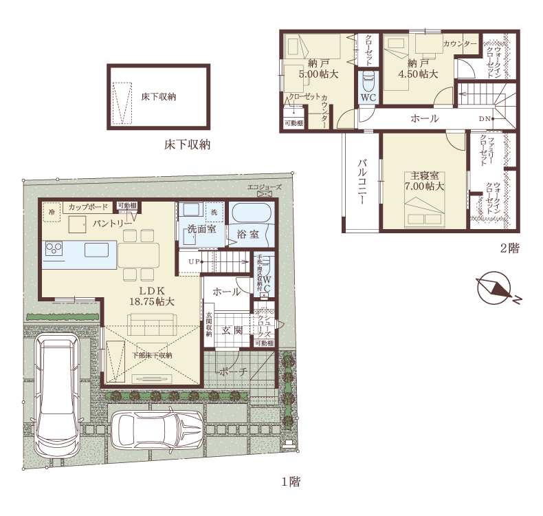 リビングに設けた約6帖の床下収納(深さ約1.2m)は、万が一に備えて防災倉庫に。2階のFCLとWICは一体型で主寝室とホールからアクセスできる便利な2Way動線です。