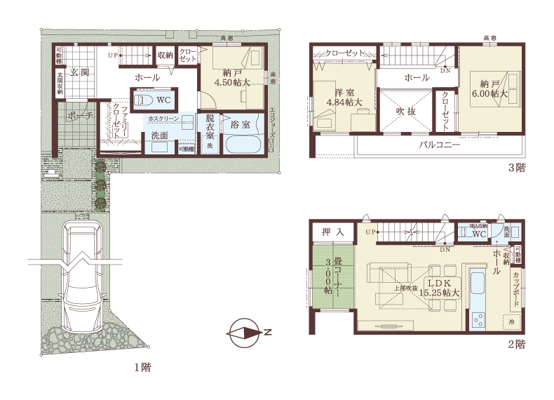 1階はWCを核にFCL・水廻り・ホールを巡る回遊動線。2階LDKは吹き抜けで高窓を設け採光を確保しました。3階は東向きのワイドなバルコニーから朝の光が各部屋に注ぎます。