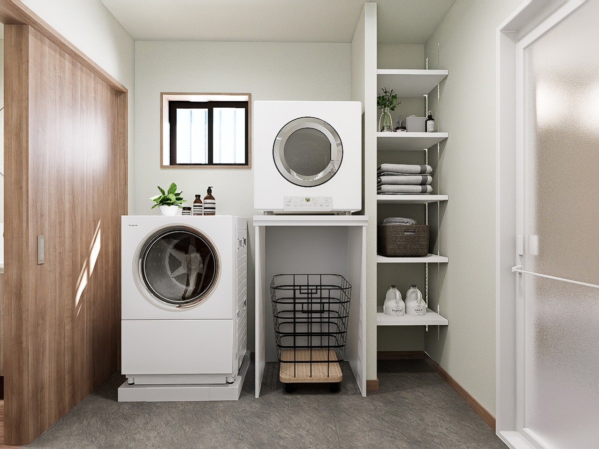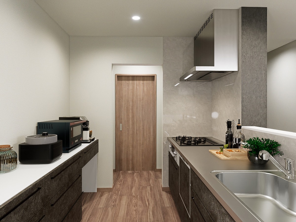 キッチンからパントリー・洗面・脱衣ランドリー・浴室まで、一直線の時短動線でママをサポート。リビング隣接のヌックはカウンターとデッキテラスを備えた寛ぎ空間です。
