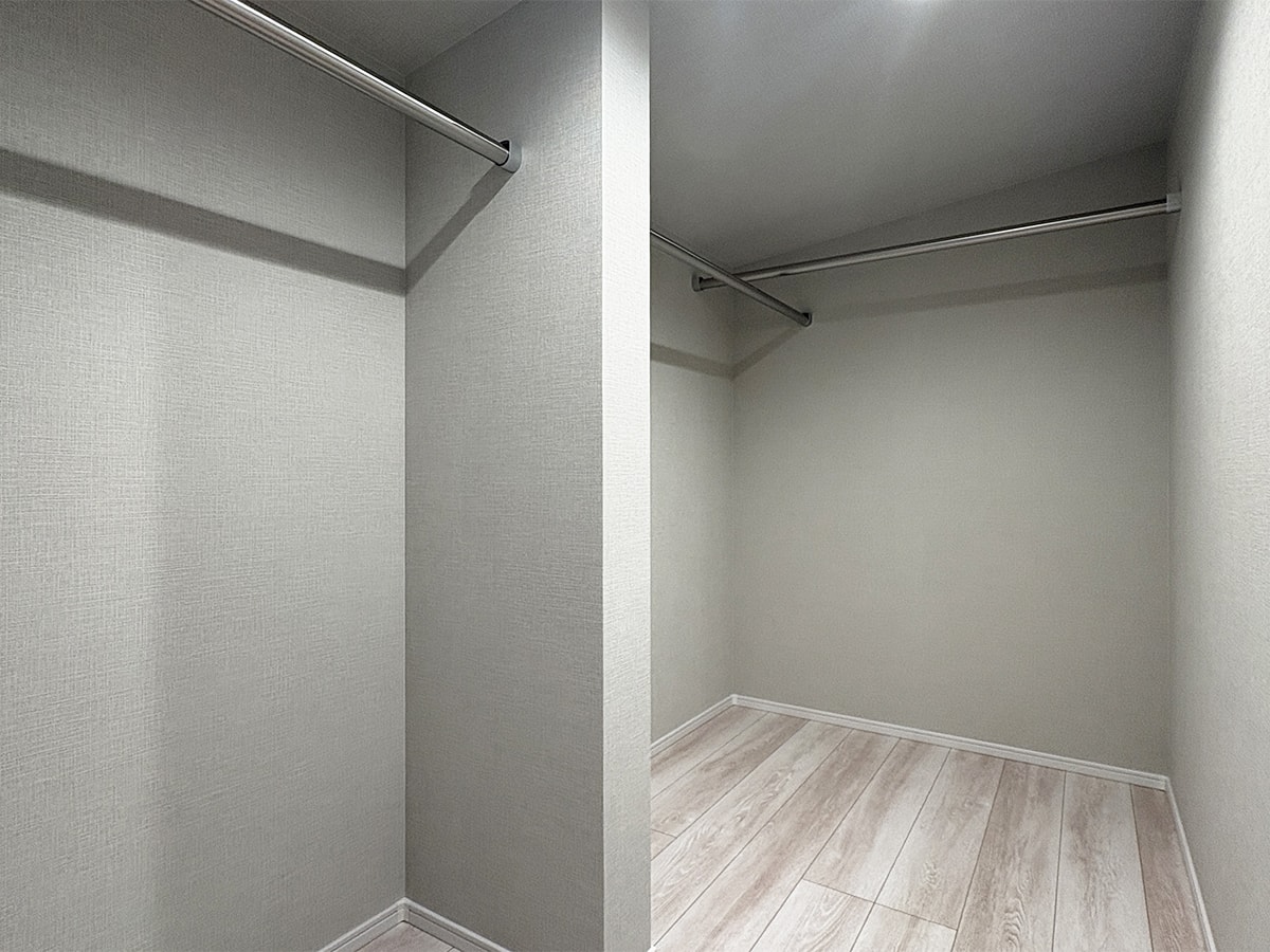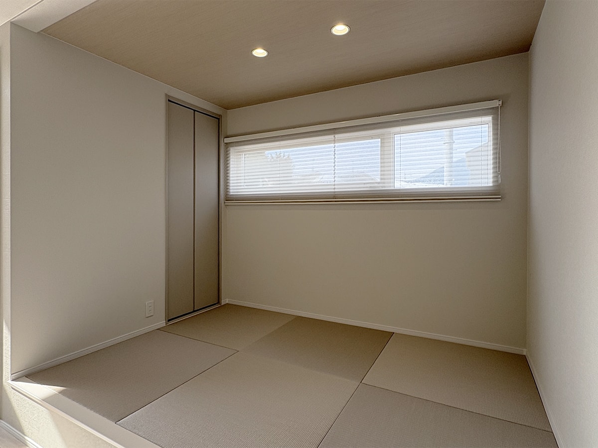 南面にワイドな掃き出しのあるリビングは高天井で伸びやかに。畳コーナーは垂れ壁で空間に奥行きと立体感を演出しました。主寝室ロフトのワークスペースとWICも注目です。