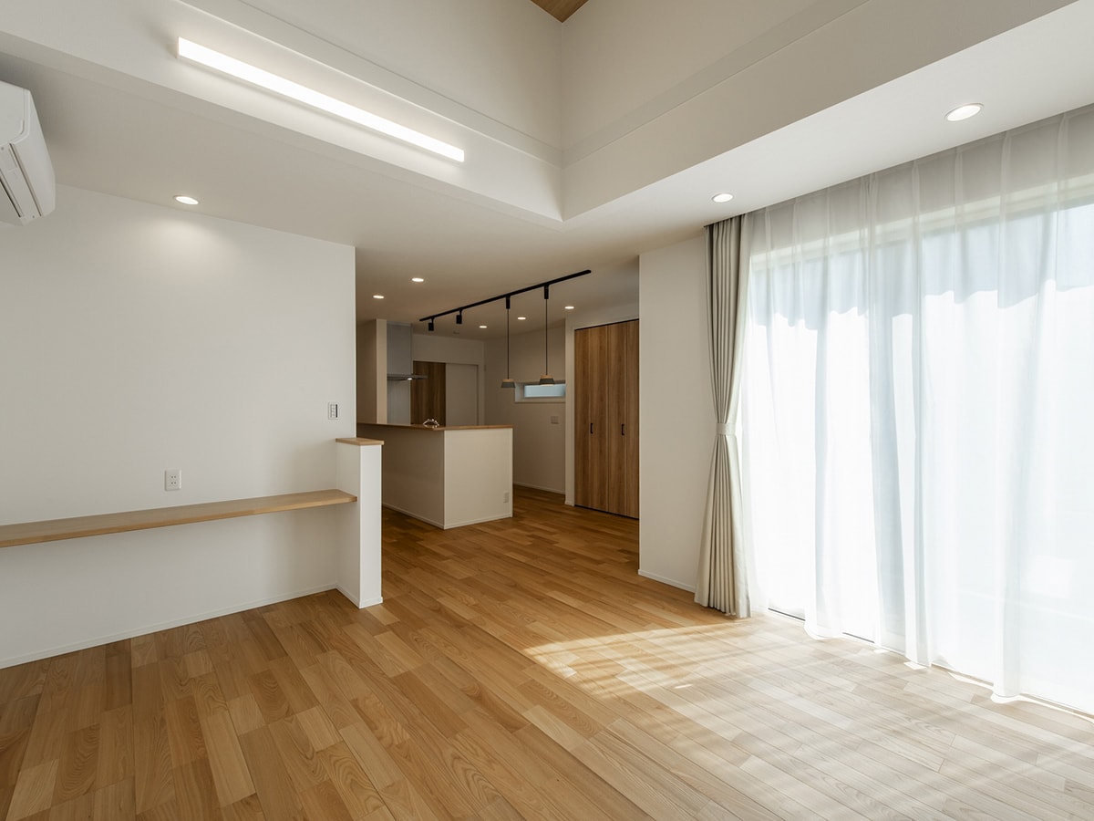 リビングサイドにはお子様のスタディコーナーやパソコン作業などに便利なカウンターを設けました。リビングの高天井は板目調のクロスをあしらい、シーリングファンを備えています。