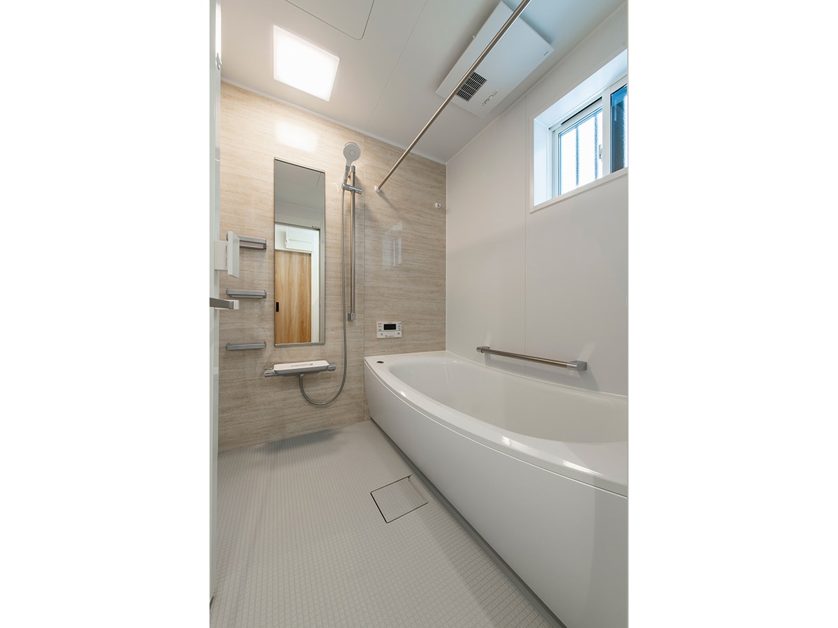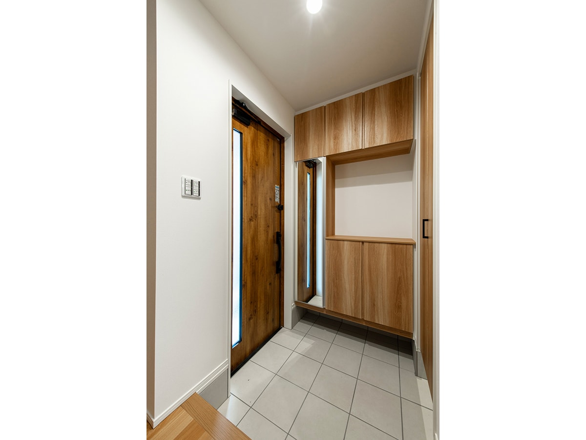 可動棚や物干し設備のある洗面室はランドリー兼用。洗面へは玄関ホールとキッチンからの2Wayアクセスで、キッチン↔︎洗面↔︎玄関ホールとタイパの良い生活動線を実現しました。