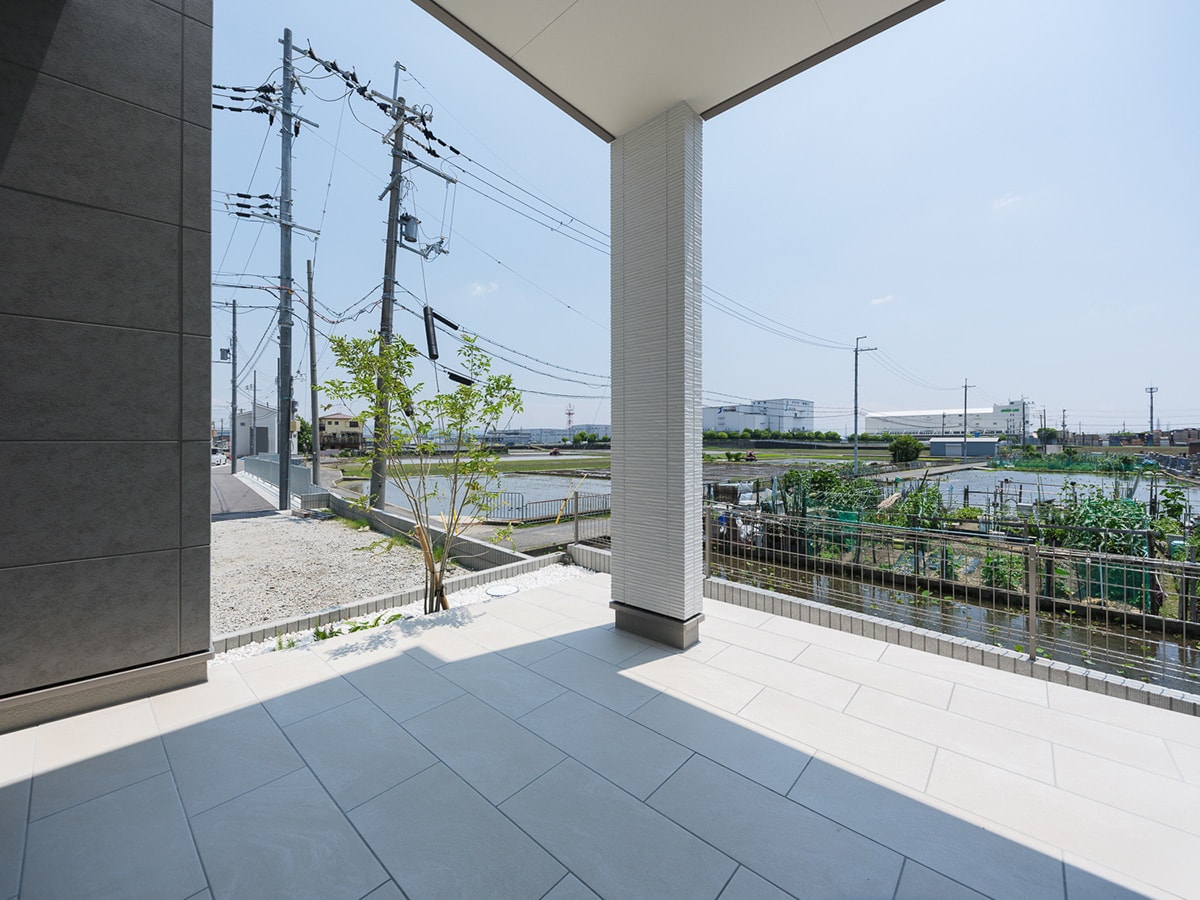おうち時間を楽しく自由に過ごせるリビングテラス。ビニールプールで水遊び、ガーデンファニチャーを置いておうちカフェも…。屋根があるため直射日光も防げます。